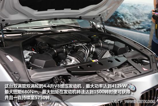 在动力上,该款车搭载了M TwinPower Turbo双涡管双涡轮增压V8汽油发动机,输出功率达412千瓦/560马力,最大扭矩为680牛米,零至百公里加速时间仅需4.2秒, 电子限速为250km/h。如果选择M性能套装,其最高时速可提高至305km/h。