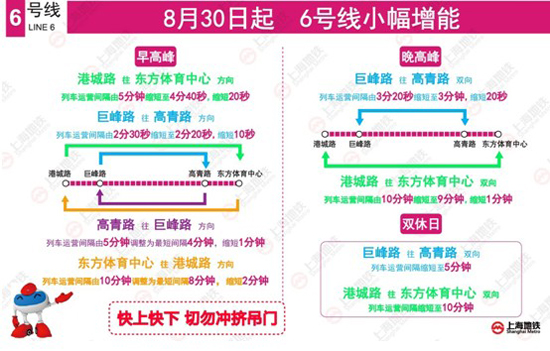 [导读] 为缓解高峰大客流集中出行的压力,30日(本周五)起,上海地铁6号线将实施小幅增能,增投上线列车,高峰时段的列车最短运行间隔缩至2分20秒。这也是上海地铁有史以来最小的行车间隔。