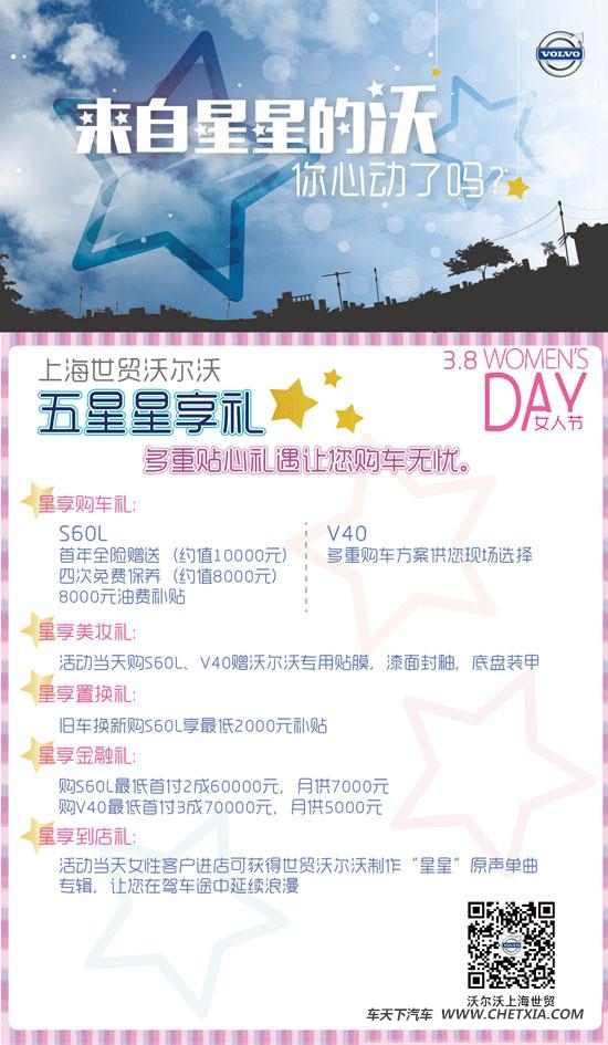 [导读] 三八女人节当天,上海世贸沃尔沃带来五星星享礼,多重贴心礼遇让您购车无忧。无论是成熟、知性的城市精英或是时尚、睿智的个性先锋,沃尔沃S60L、V40都将会是您最佳的座驾选择。活动当天女性客户进店更可获得世贸沃尔沃独家制作"星星"原声单曲专辑,让您在驾车途中延续浪漫。